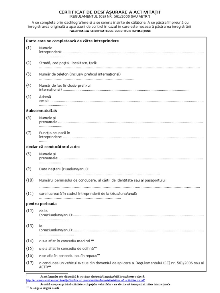 vizitati articolul complet aici : https://asociatia-phoenix.ro/calificare-specializare/specialist-in-activitatea-de-coaching Certificat de desfasurare a activitatii (1) regulament (ce) nr.561/2006 sau aetr(2) a se completa prin dactilografiere si a se semna inainte de calatorie a se pastra impreuna cu inregistrarea originala a aparaturii de control in cazul in care este necesara pastrarea inregistrarii. Vous pouvez à tout moment supprimer votre abonnement dans votre espace personnel. Sau cu acordul european privind munca echipajelor vehiculelor care efectuează transporturi rutiere internaţionale (aetr) (*).