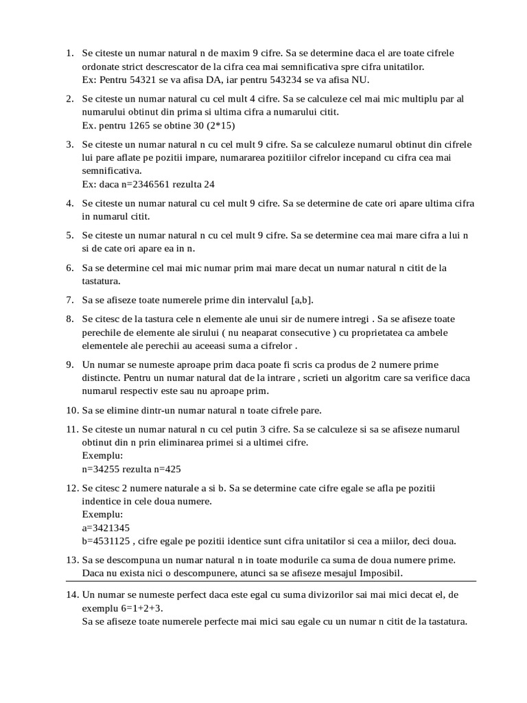 vizitati articolul complet aici : https://pdfslide.net/documents/probleme-informatica.html Se citeste de la tastatura un sir de caractere sa se numere vocalele pana la. Aceasta nu este o definiție riguroasă. Un număr natural mai mare decât 1 care nu este prim se numește compus sau decompozabil sau reductibil.