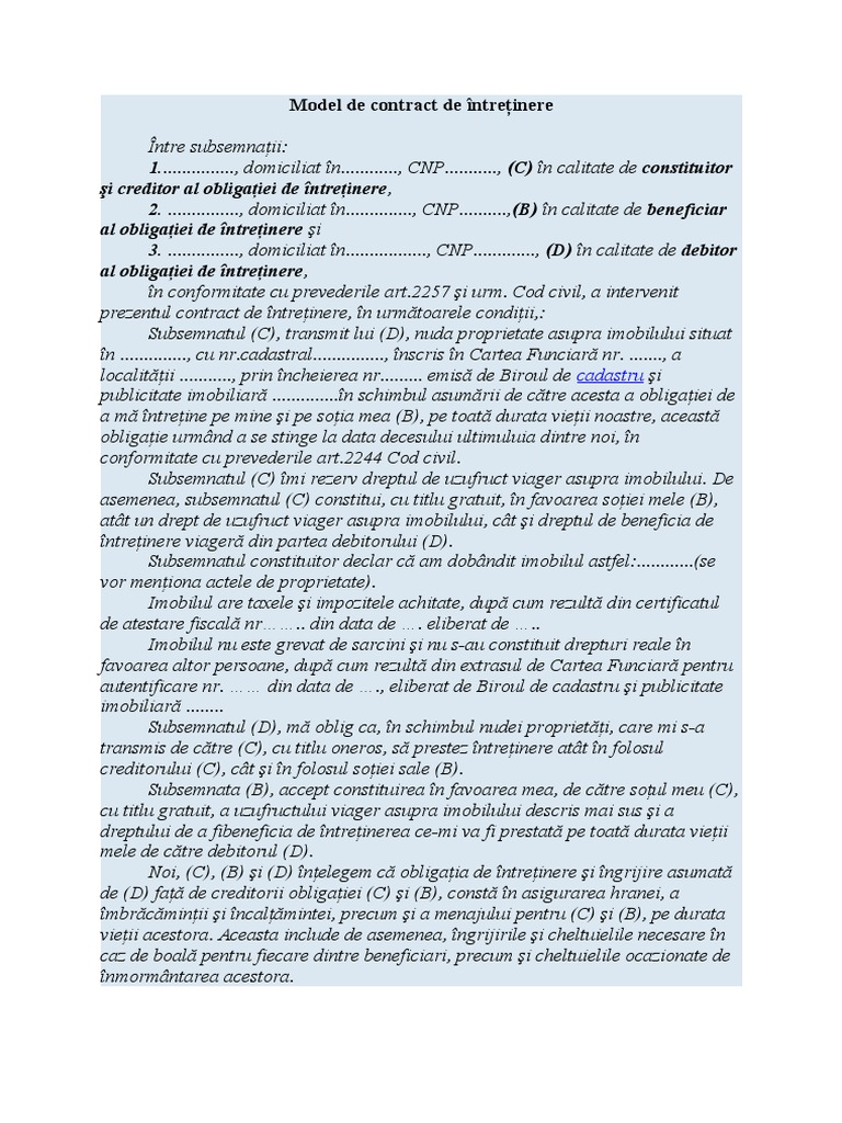 vizitati articolul complet aici : http://www.academia.edu/31117769/CIVIL_Teste_grila_Minispete Prezentul contract va fi reziliat după expirarea termenului de înştiinţare. Contractul de întreţinere este o înţelegere între două părţi: Contractul de întreţinere este actul prin care o parte se obligă să efectueze prestaţiile necesare întreţinerii şi îngrijirii celeilalte părţi sau a unui terţ părţile contractului de întreţinere sunt creditorul și debitorul obligaţiei de întreţinere.
