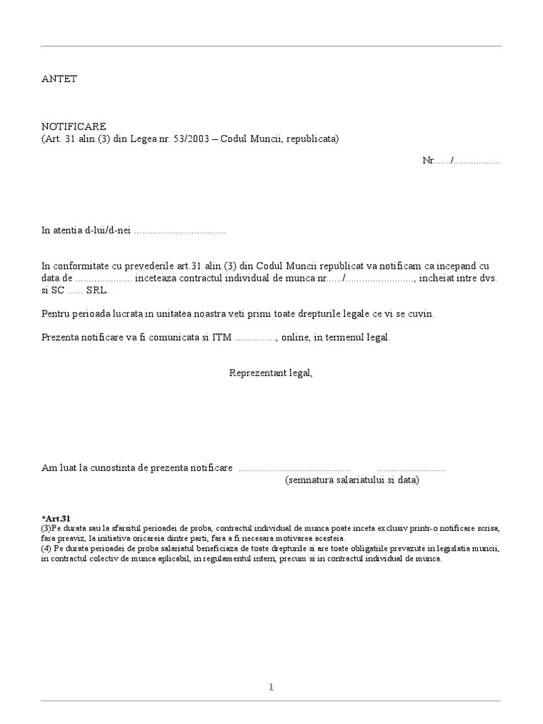 Daca sunteti angajata pe perioada determinata atunci angajatorul nu ar trebui sa adreseze o astfel de. Cadrul legislativ pentru includerea perioadei de probă în contract durata perioadei de probă drepturile salariatului în timpul perioadei de probă o persoană cu handicap are nevoie și de un preaviz plătit, de minimum 30 de zile lucrătoare, acordat la desfacerea contractului de muncă, din. Va fi menționată în conținutul contractului individual de acestea pot duce la incetarea contractului de munca in perioada de proba.