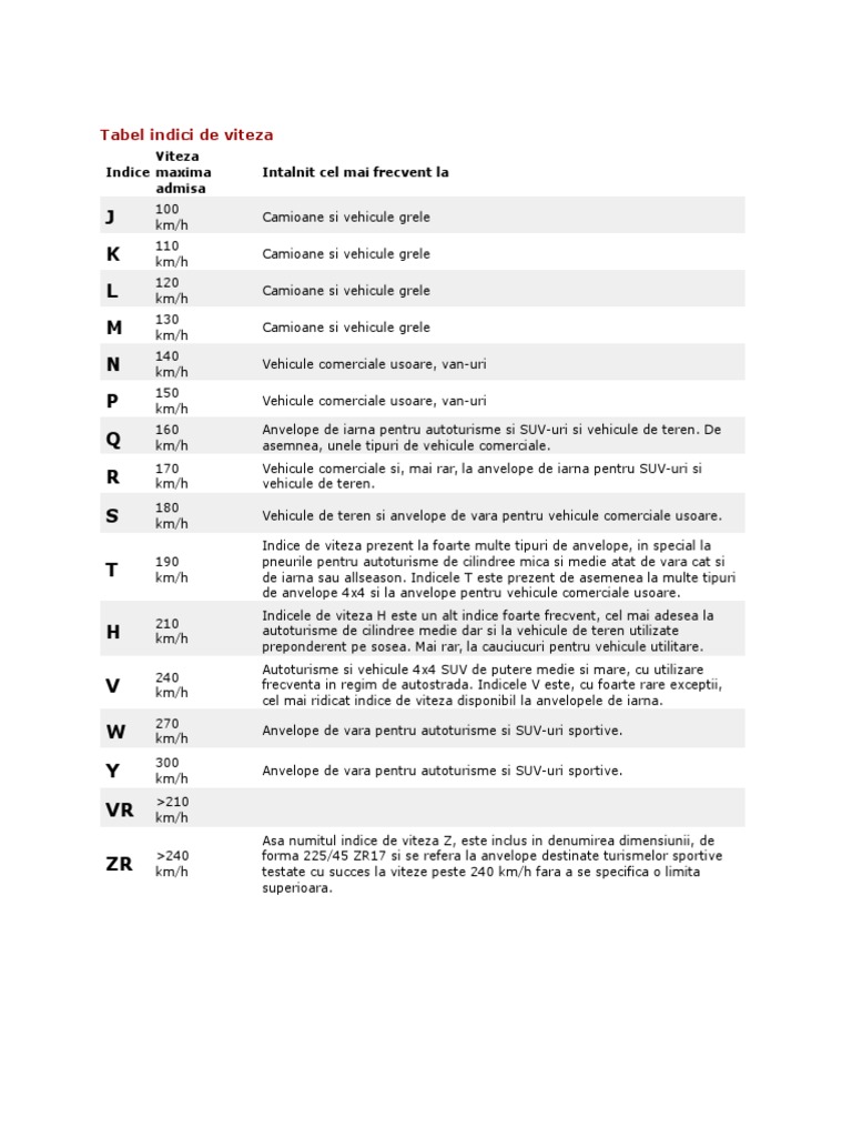 Marcajul 'indice de viteză' este un coeficient care descrie viteza maximă admisă pentru o anumită anvelopă. Autovehiculele nu trebuie să fie echipate cu anvelope cu indicele de. Sunt calcula?i în urma testelor de laborator în care anvelopele sunt supuse presiunilor unei benzi rulante cu un diametru mare care s.